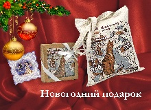 Подарочная сумка бежевая с новогодней открыткой "Кошарики на рыбалке"
