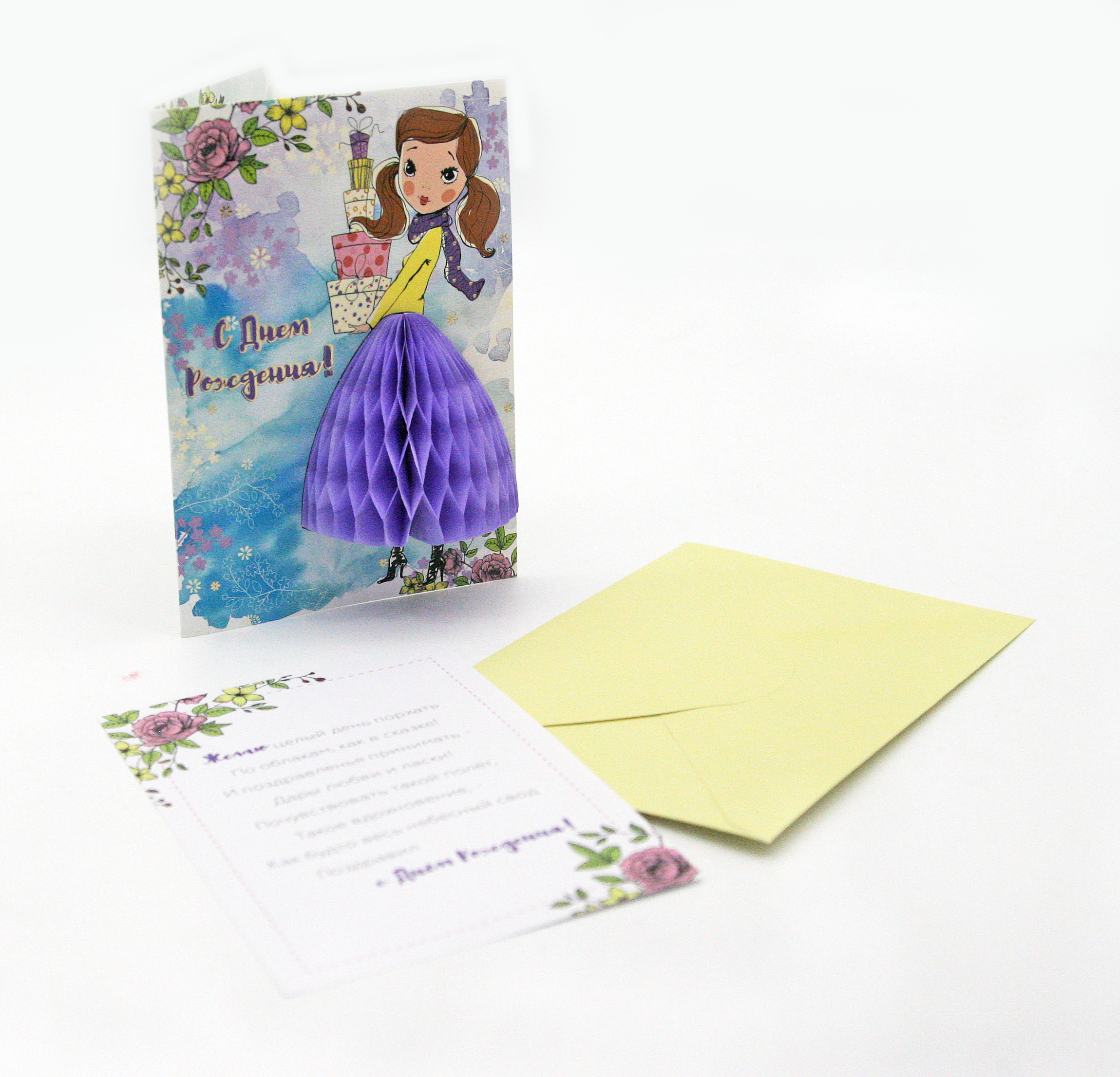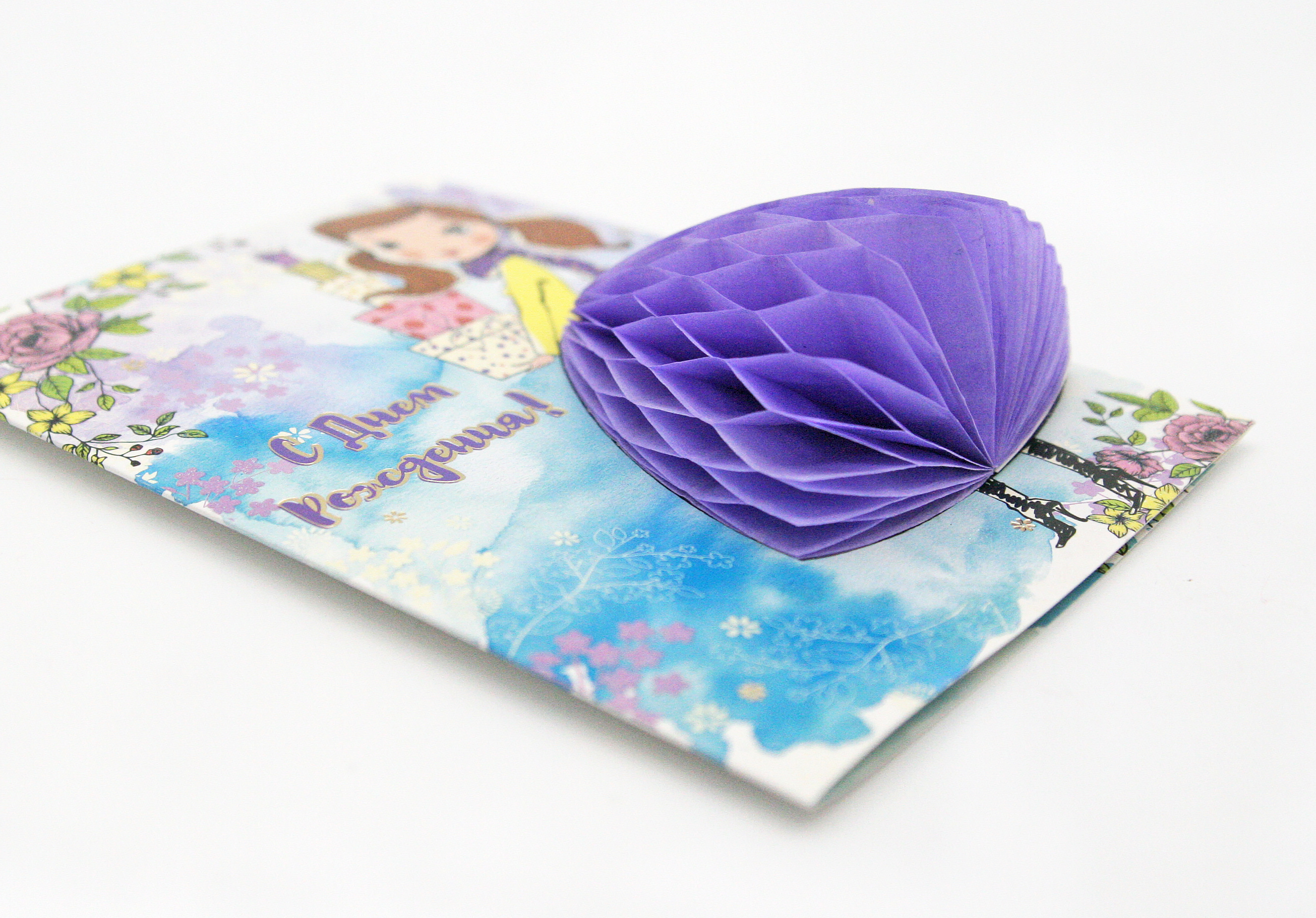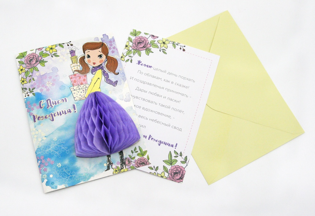 Техническая характеристика:золотая фольга,перламутровый глиттер, объемный элемент из цветной бумаги ячейками на «липучке», внутри вкладыш из бумаги с текстом