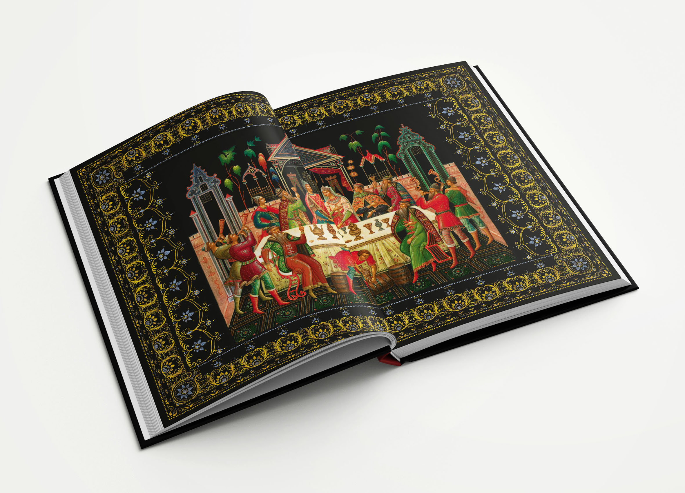 В альбом - сувенир включены сказки А. С. Пушкина; "Руслан и Людмила", "Сказка о царе Салтане", "Сказка о Золотом петушке", "Сказка о попе и о работнике его балде", "Сказка о рыбаке и рыбке", к сюжетам которых постоянно обращаются художники Палеха - прославленного старинного центра иконописи и лаковой миниатюры. Фантастически красивая живопись украшает шкатулки, баульчики, пластины, броши, пудреницы и другие изделия, изготовленные из папье-маше. Она предстает перед нами драгоценным сплавом сверкающих ярких красок и таинственного черного фона, оживленного вспышками золотого ажурного орнамента.