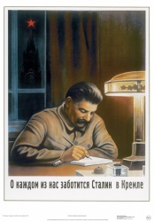 Постер Советский плакат О каждом из нас заботится Сталин в Кремле.
