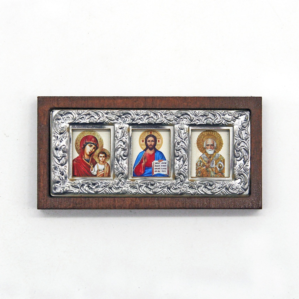 Икона в машину на липкой ленте. На иконе изображены три главных святых.