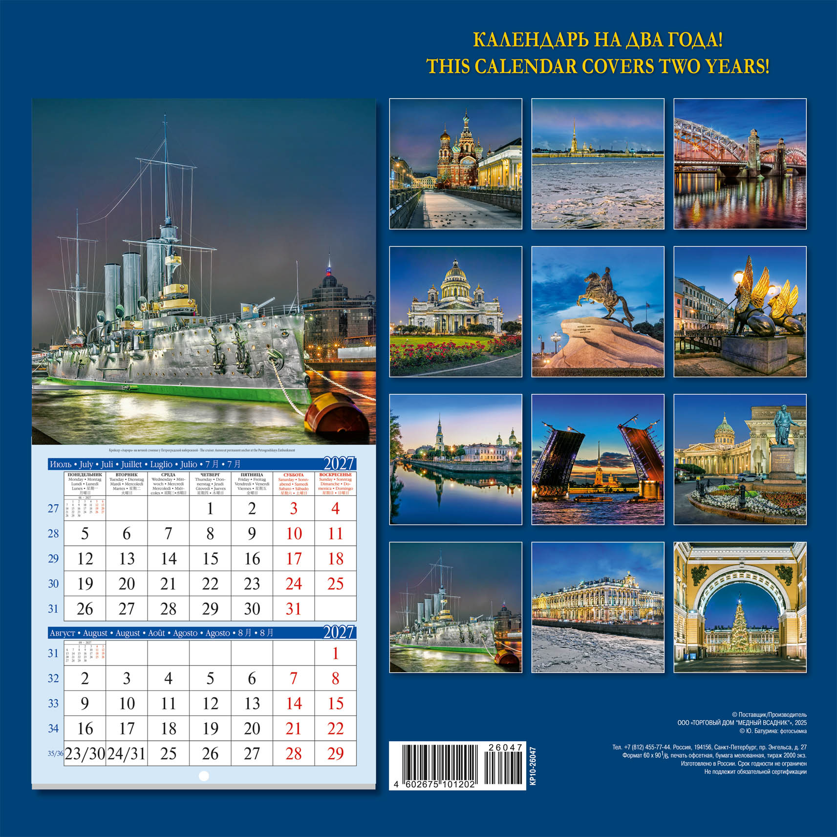 Настенный календарь " Ночной Санкт-Петербург" на 2026-2027 год - лучшее, что можно приобрести на память о посещении Северной столицы России.