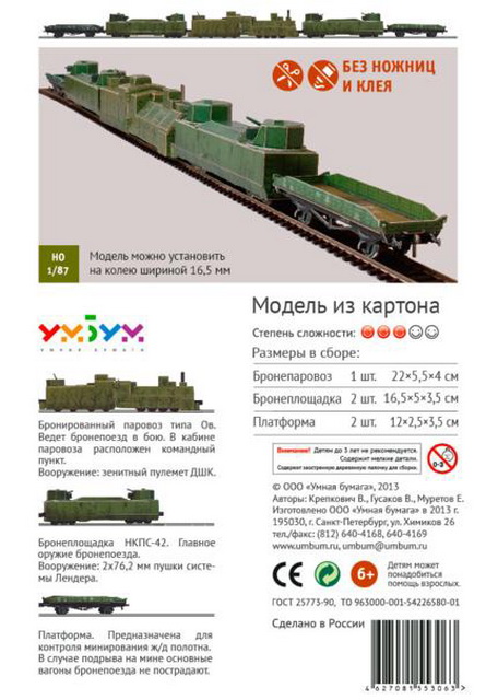 Стендовая модель соответствует колее 16,5 мм, ее можно установить на стандартные рельсы масштаба 1/87 (H0). Колеса не крутятся, но общего впечатления это не портит. Аккуратно собранная модель удивит любого зрителя. С двух шагов невозможно даже предположить, что модель выполнена из картона! Орудийные башни вращаются, стволы орудий можно поднимать и опускать. В наборе присутствуют картонные детали сцепок для соединения вагонов между собой. Вагоны соединяются вполне надежно и весь бронепоезд можно передвигать за первый или последний вагон.